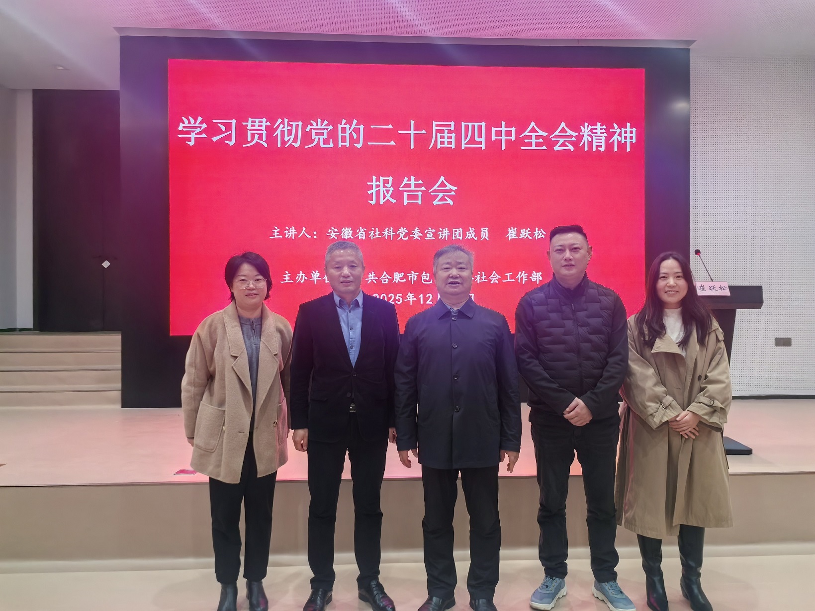 2025年12月18日上午,包河區新興領域學習貫徹黨的二十屆四中全會精神宣講報告會在中寰科技中心一樓報告廳隆重舉行。寰宇檢測公司黨支部高度重視此次學習,控股總公司吳國保院長、公司總經理盛宗帶隊出席,與公司黨員代表、黨務工作者一同參加了本次宣講活動。