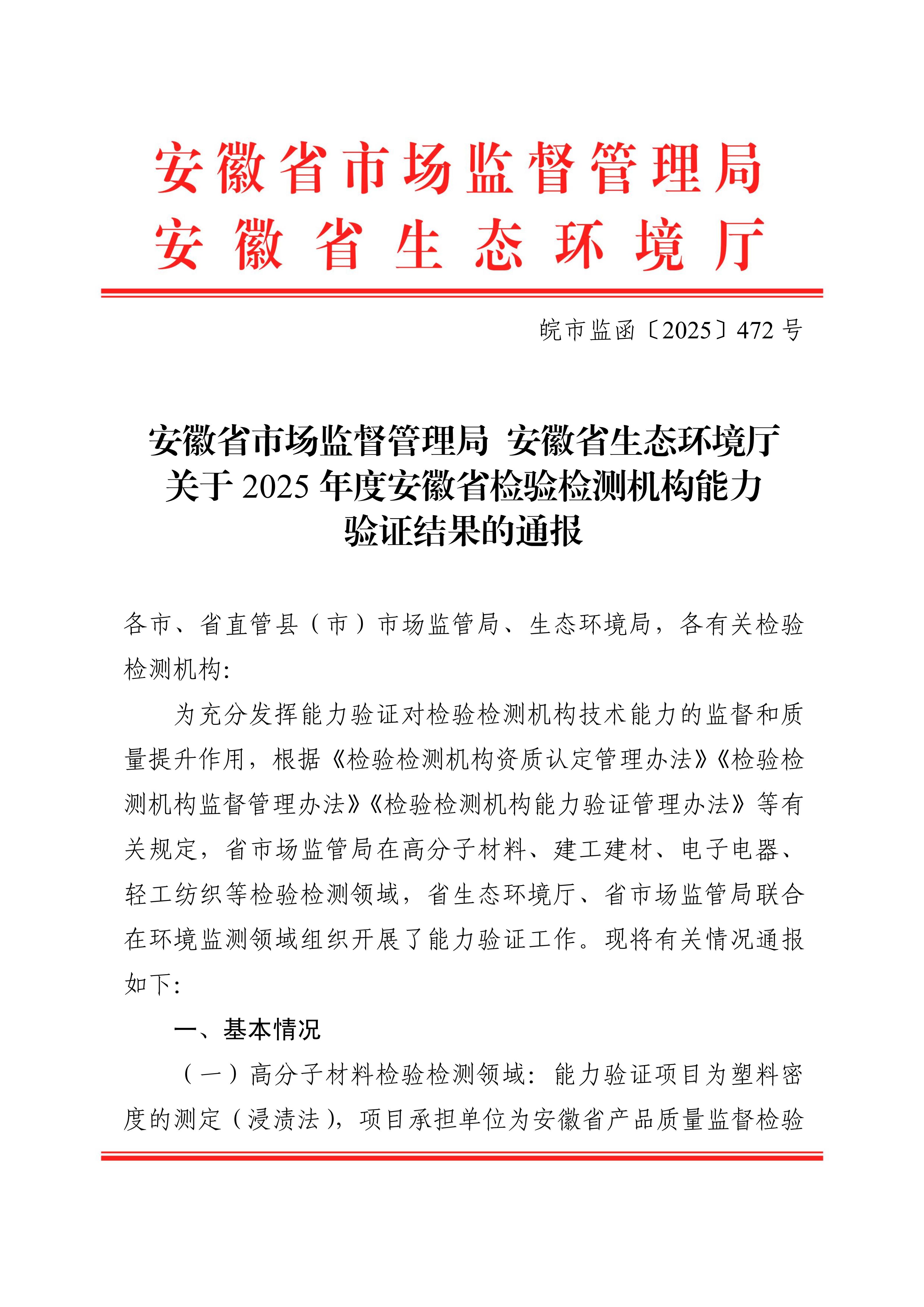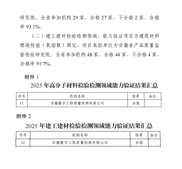 近日,安徽省市場監(jiān)督管理局、安徽省生態(tài)環(huán)境廳聯(lián)合發(fā)布了《2025年度安徽省檢驗檢測機構能力驗證結果的通報》。安徽寰宇工程質(zhì)量檢測有限公司在高分子材料、建工建材兩個檢驗檢測領域的能力驗證中,均取得“合格”結果,充分展現(xiàn)了公司過硬的技術實力和可靠的質(zhì)量管理能力。