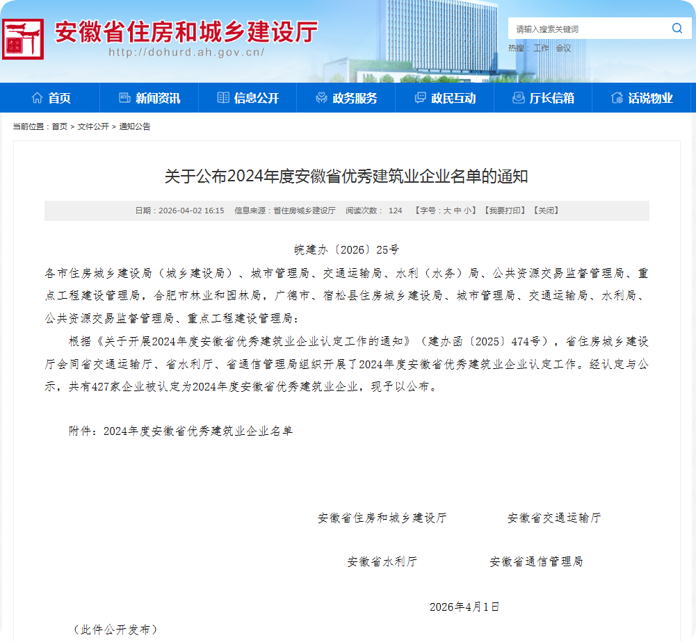 近日,安徽省住房和城鄉建設廳正式公布“2024年度安徽省優秀建筑業企業”名單。寰宇檢測公司憑借綜合實力從全省眾多參評企業中脫穎而出,成功榮獲“2024年度安徽省優秀建筑業企業”榮譽稱號。